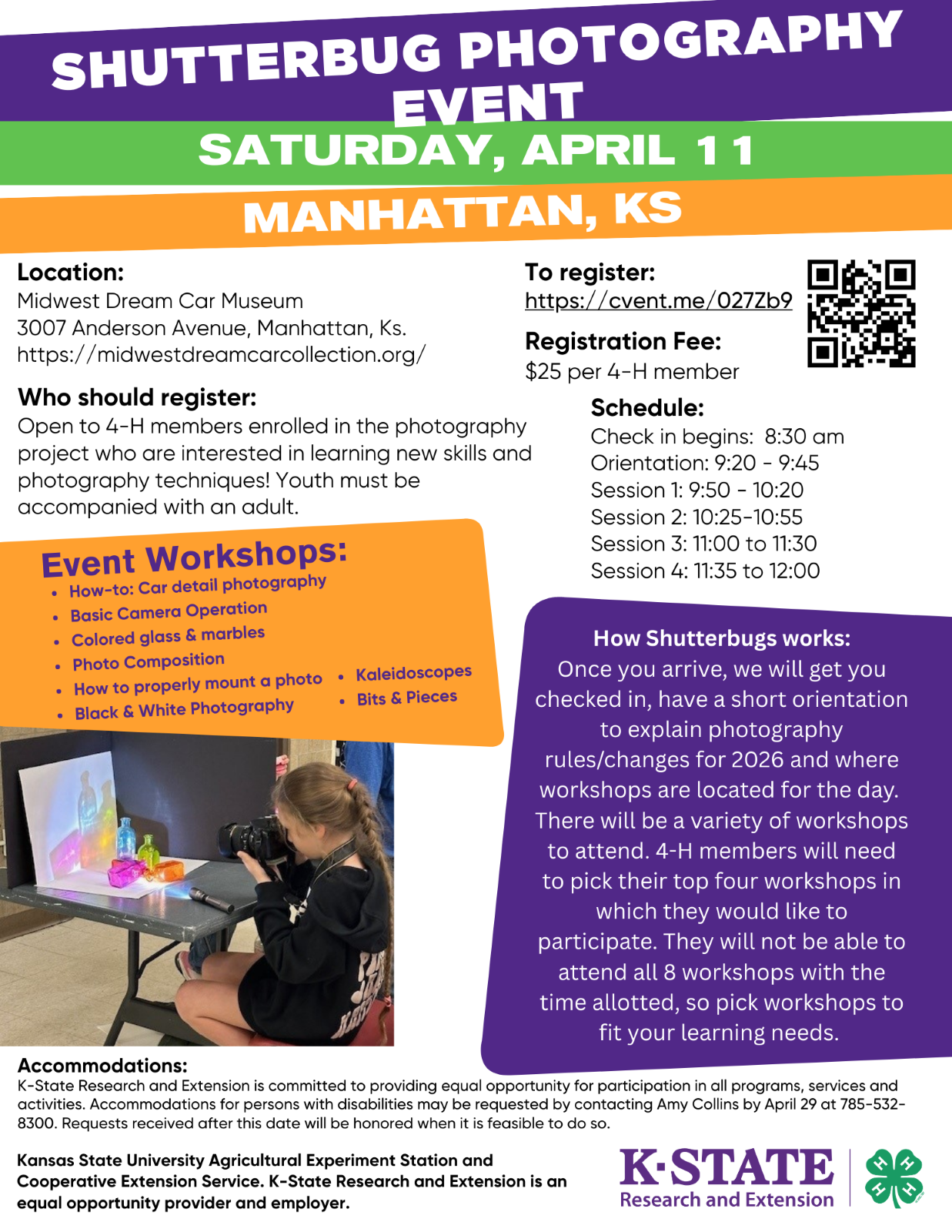 Shutterbug events are photography workshops put on across the state, and are a perfect opportunity to develop new camera skills, hone your creative talents and try new photography techniques. Workshops are typically scheduled as a morning session and concentrate on a variety of aspects of composition. Sessions focus on topics including Portfolio, Camera Features, Panning, Close-ups, Aperture Settings & Kaleidoscopes/Reflections.